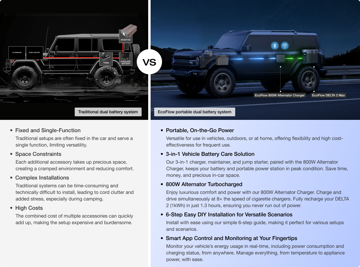 EcoFlow's portable dual battery system outperforms traditional 12V setups for 4WD. Enjoy easy DIY installation with no fixed wiring required. Pair it with EcoFlow's DELTA Series and 800W Alternator Charger for record-fast charging. Power 99% of everyday appliances with zero fumes, noise, or maintenance.