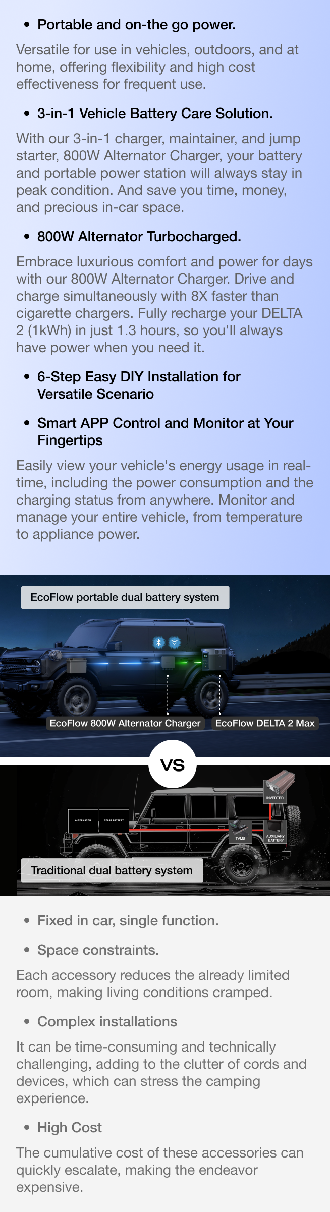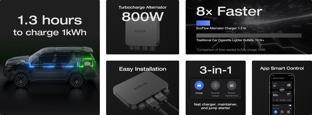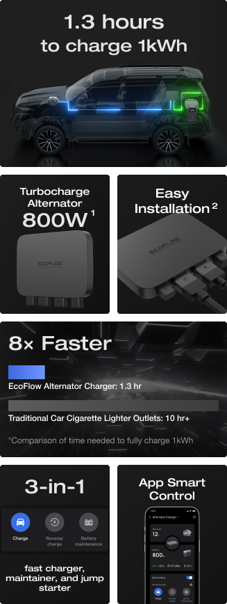 Paired with EcoFlow 800W Alternator Charger FREE Energy with Every Minute Driving 3-in-1 Fast Charger, Maintainer, and Battery Booster 8× Faster than Traditional Car Chargers.