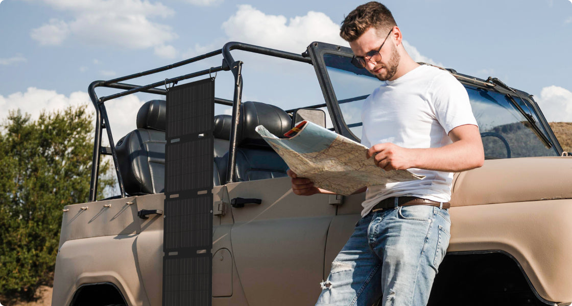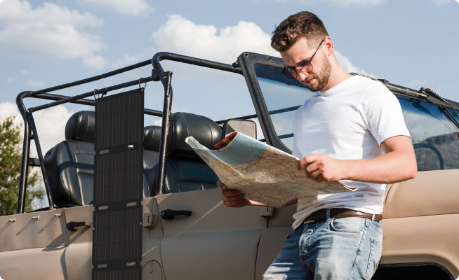 With its folding four-panel structure,the portable solar panel significantly reduces in size when folded, allowing it to easily fit into compact spaces such as backpacks, SUVs, or minivans.
