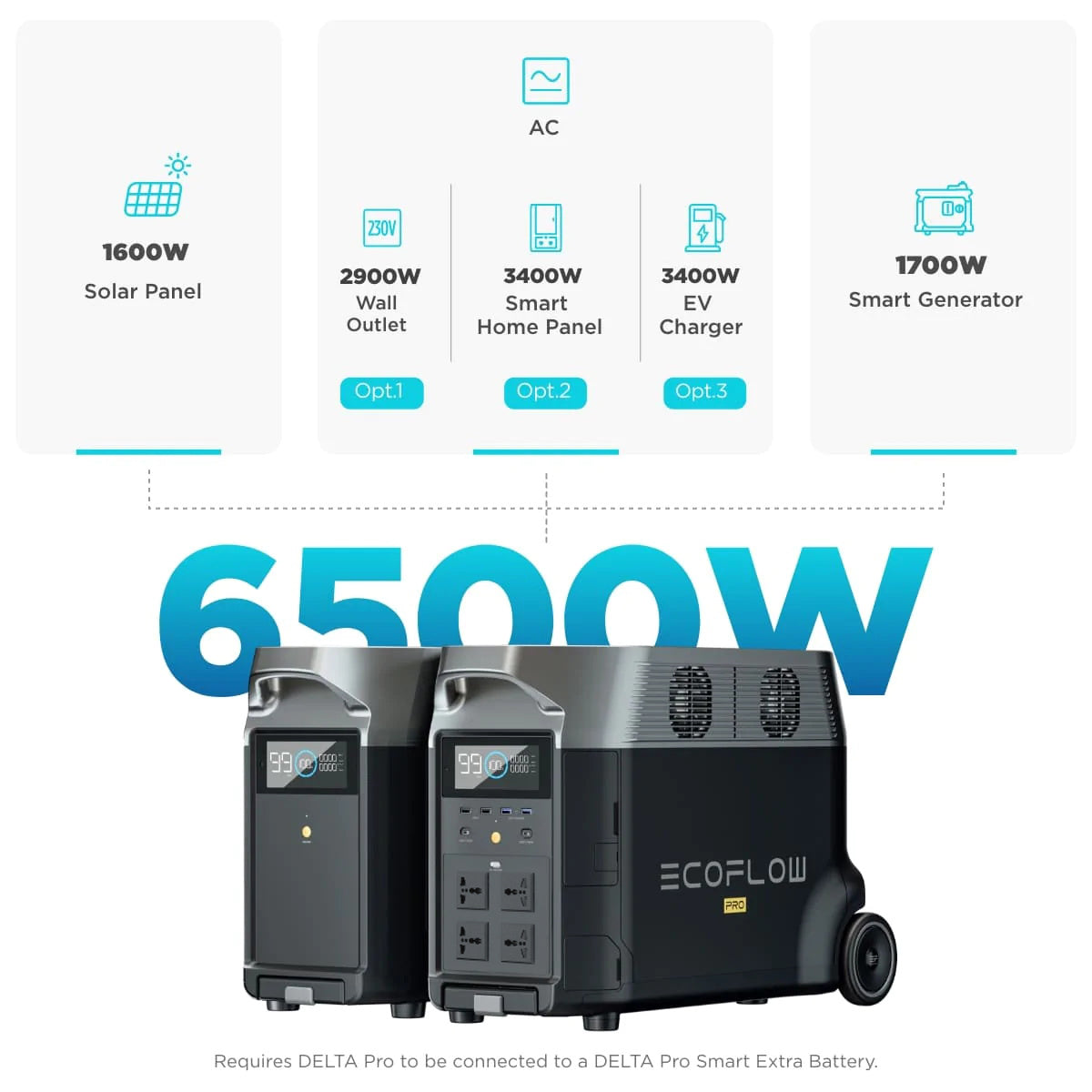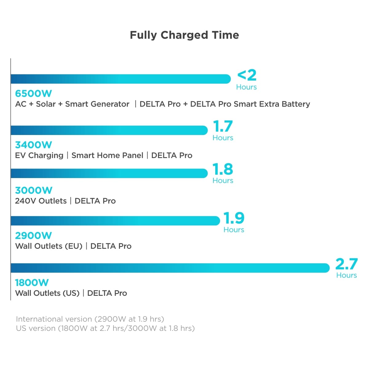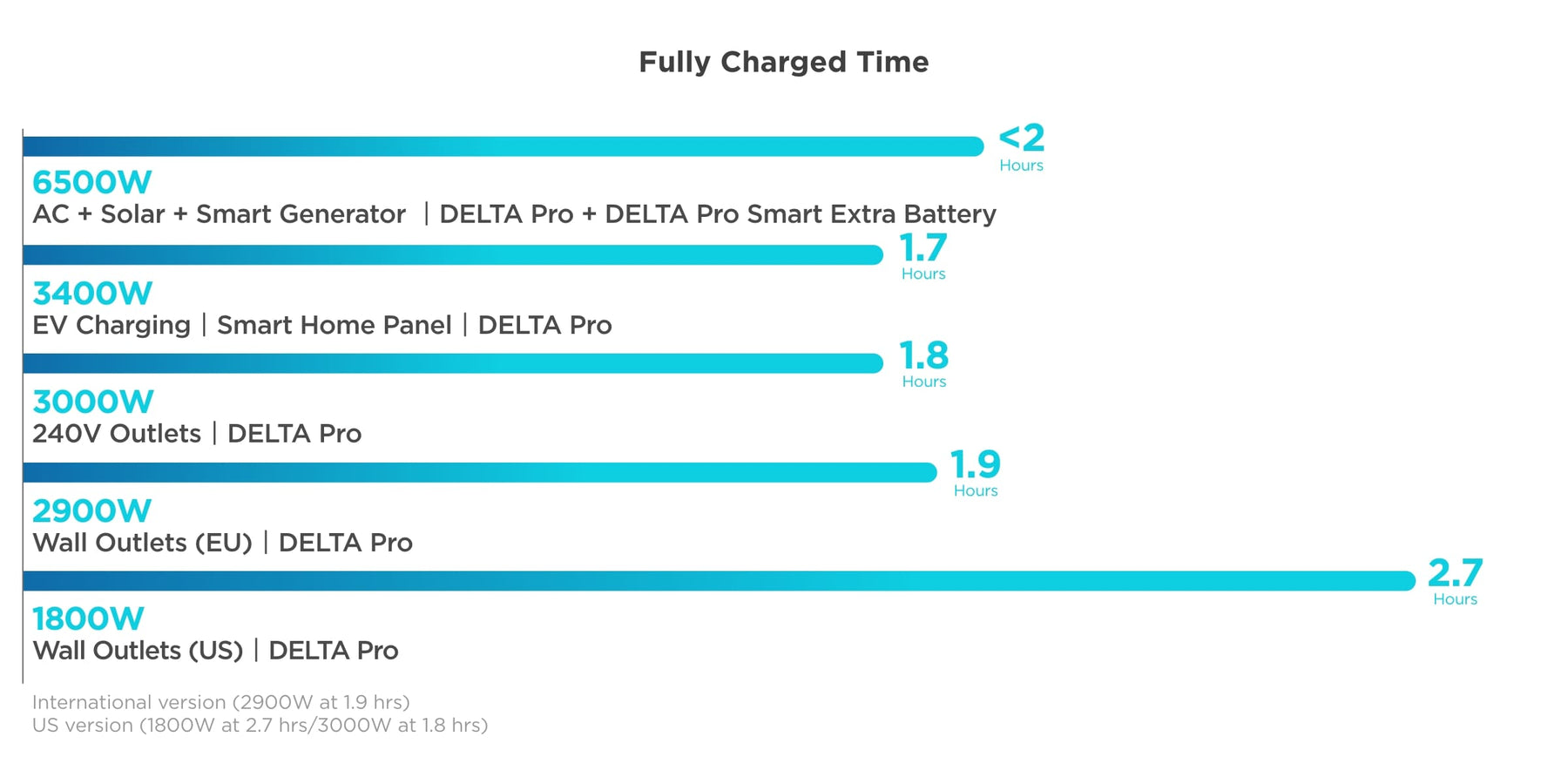 When charging DELTA Pro and its extra battery together, you can reach 6500W max charging speeds by combining AC, solar and Smart Generator methods. For DELTA Pro single unit, you can recharge it at standard wall outlets (2900W max), at EV station (3400W max)/Smart Home Panel (3000W max).