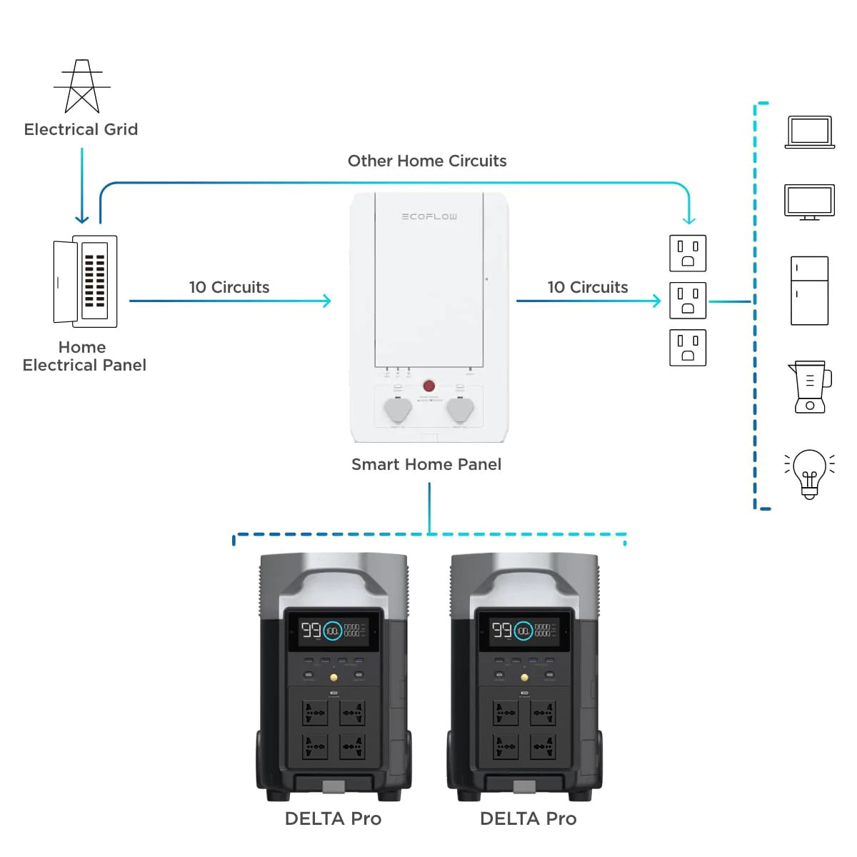 The new EcoFlow Smart Home Panel is the heart of the DELTA Pro home battery ecosystem. It integrates up to two DELTA Pro units with 10 home circuits. Each DELTA Pro can be connected with extra batteries, solar panels, or smart generators, giving you uninterrupted power during blackouts, smart energy management for your critical loads, and lower energy bills.