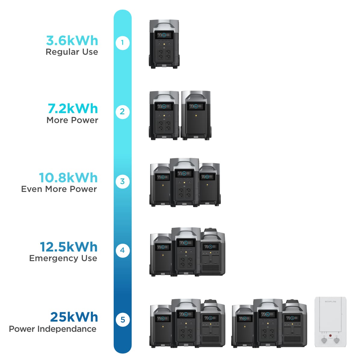 DELTA Pro's expandable ecosystem provides you with power during blackouts, customizable energy around the clock, and lower energy bills. How does it achieve all this? With a selection of extra batteries, smart generators, solar trackers, wind turbines, a smart home panel, and more. From backup power to reducing your reliance on the grid with green alternatives, the DELTA Pro ecosystem can be customized to your needs.