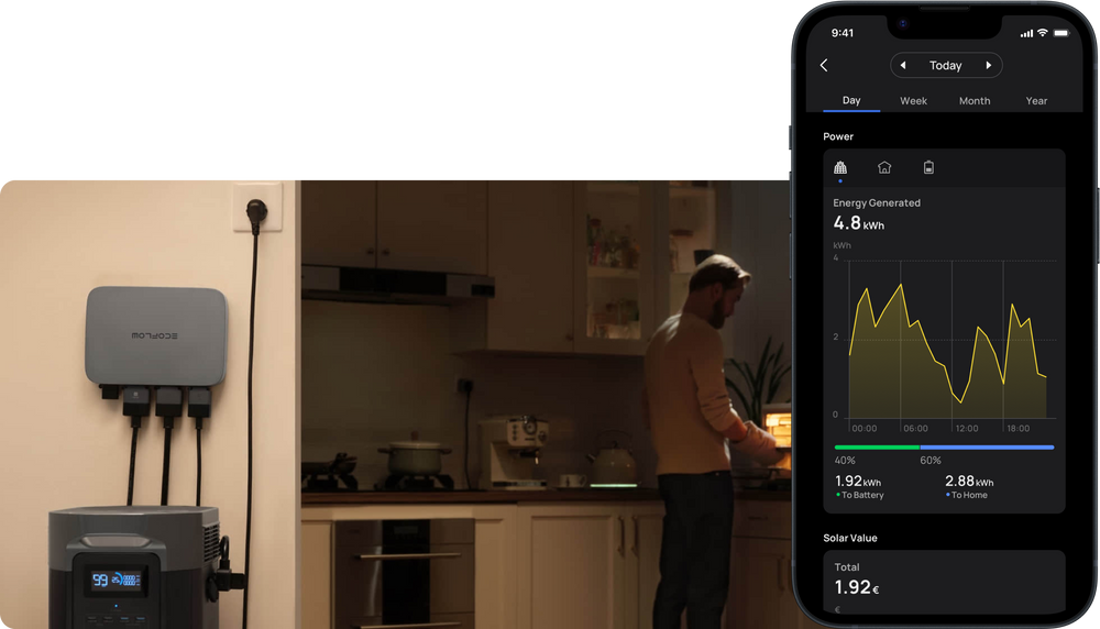 Smart Plugs monitor appliances' energy consumption in real time, so the microinverter can allocate just the right amount of electricity to each appliance, and the surplus to a portable power station. During peak hours, it prioritises home use. And most of the energy gets stored in off-peak times.