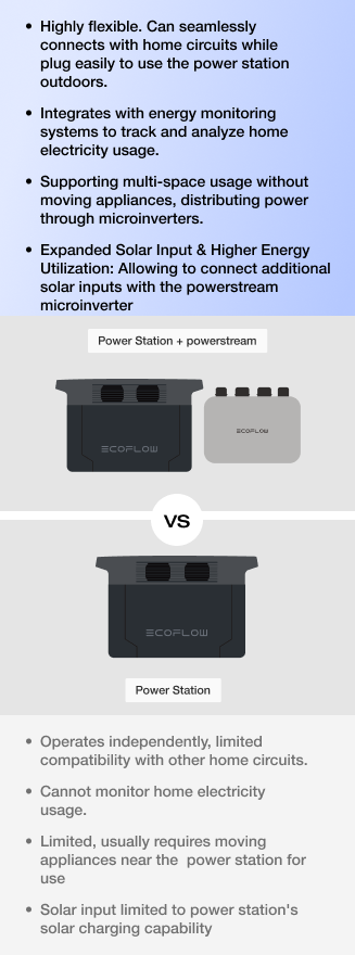 For safety concerns, PowerStream Microinverter will stop the current output after a power outage in the home, but Portable Power Station can be used as a backup power supply to connect to the appliance.