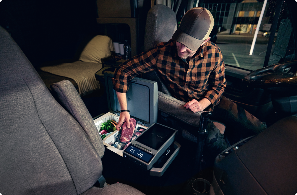 One lever and one set of wheels, all detachable.[4] Wheel the fridge-freezer to wherever your adventures take you. Detach these accessories and fit Glacier right on your RV's countertop, in the passenger seat, and in other compact spaces.