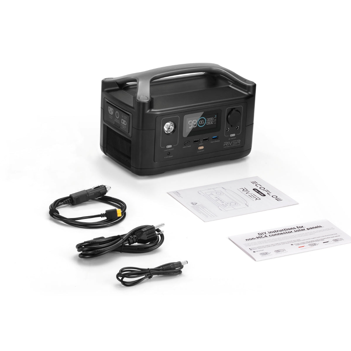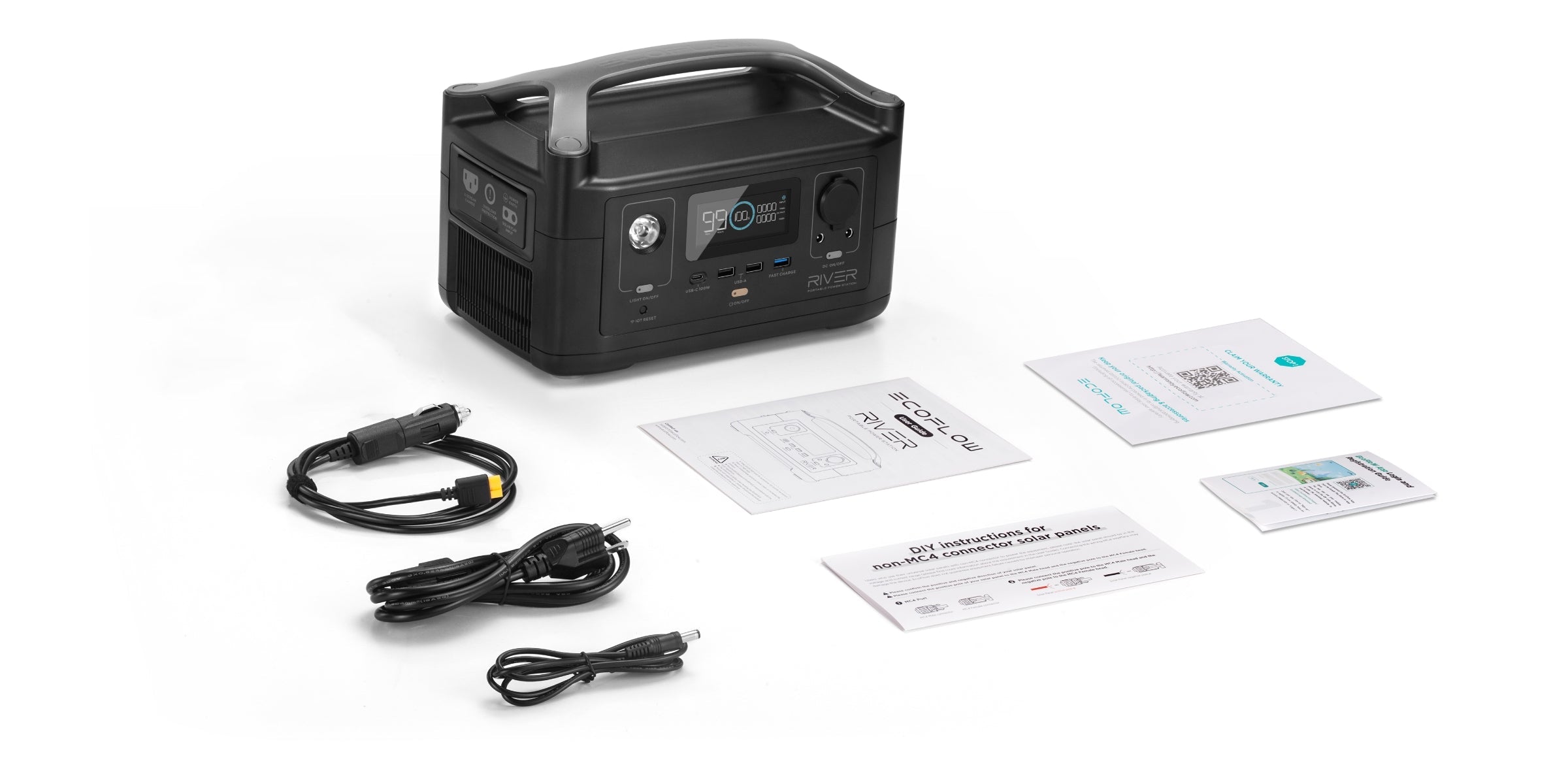 1. EcoFlow RIVER Portable Power Station 2. DC5521-DC5525 Cable 3. 1.5m AC Charging Cable 4. 1.5m Car Charging Cable 5. User Manual 6. Warranty Card